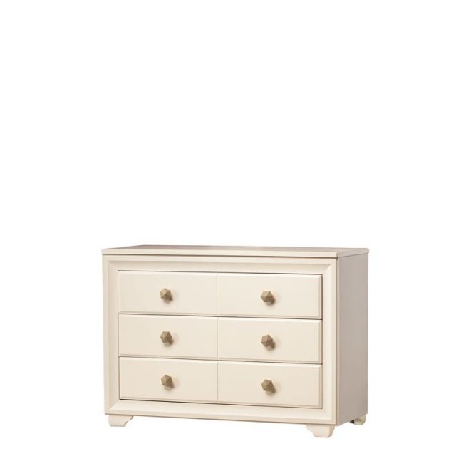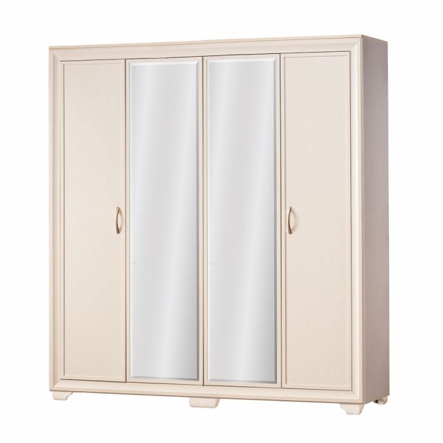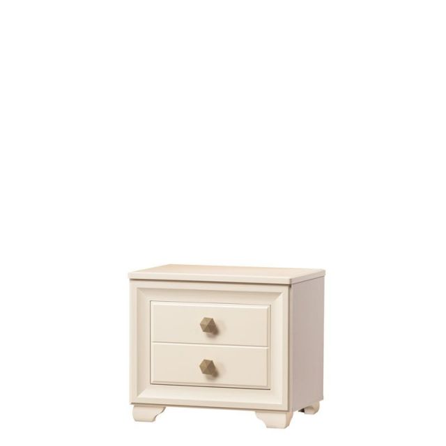 «кремовый белый», который уже успел полюбиться клиентам фабрики по серии «Марлен», но отличается более современным дизайном. В нем отсутствуют замысловатые декоративные элементы и колонны, на первый план выходят прямые линии. Украшением комплекта служат оригинальные итальянские ручки золотистого цвета. В оформлении фасадов комода сделан необычный ход. Некоторые линии, делящие ящики на, казалось бы, самостоятельные отсеки, на самом деле являются фрезеровкой. Кровать оснащена мягким тканевым изголовьем, что является сейчас безусловным трендом.